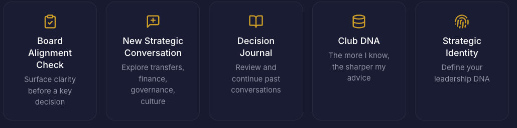 | For aspiring Sporting Directors, former players, and leaders exploring the role. | For Sporting Directors operating in lower leagues who want to sharpen their leadership and decision-making. | For Sporting Directors operating in professional clubs who require a confidential strategic thinking partner. |